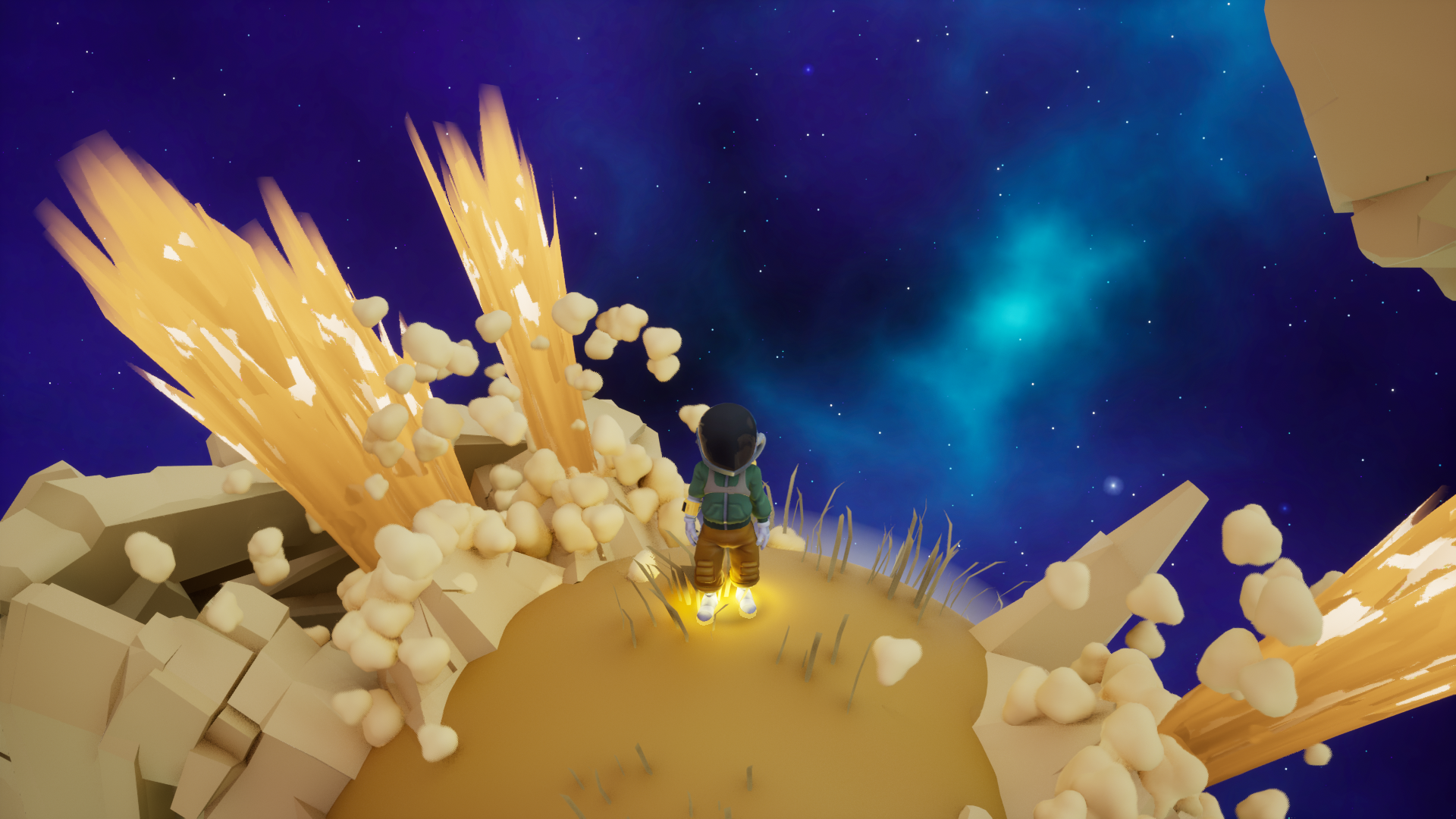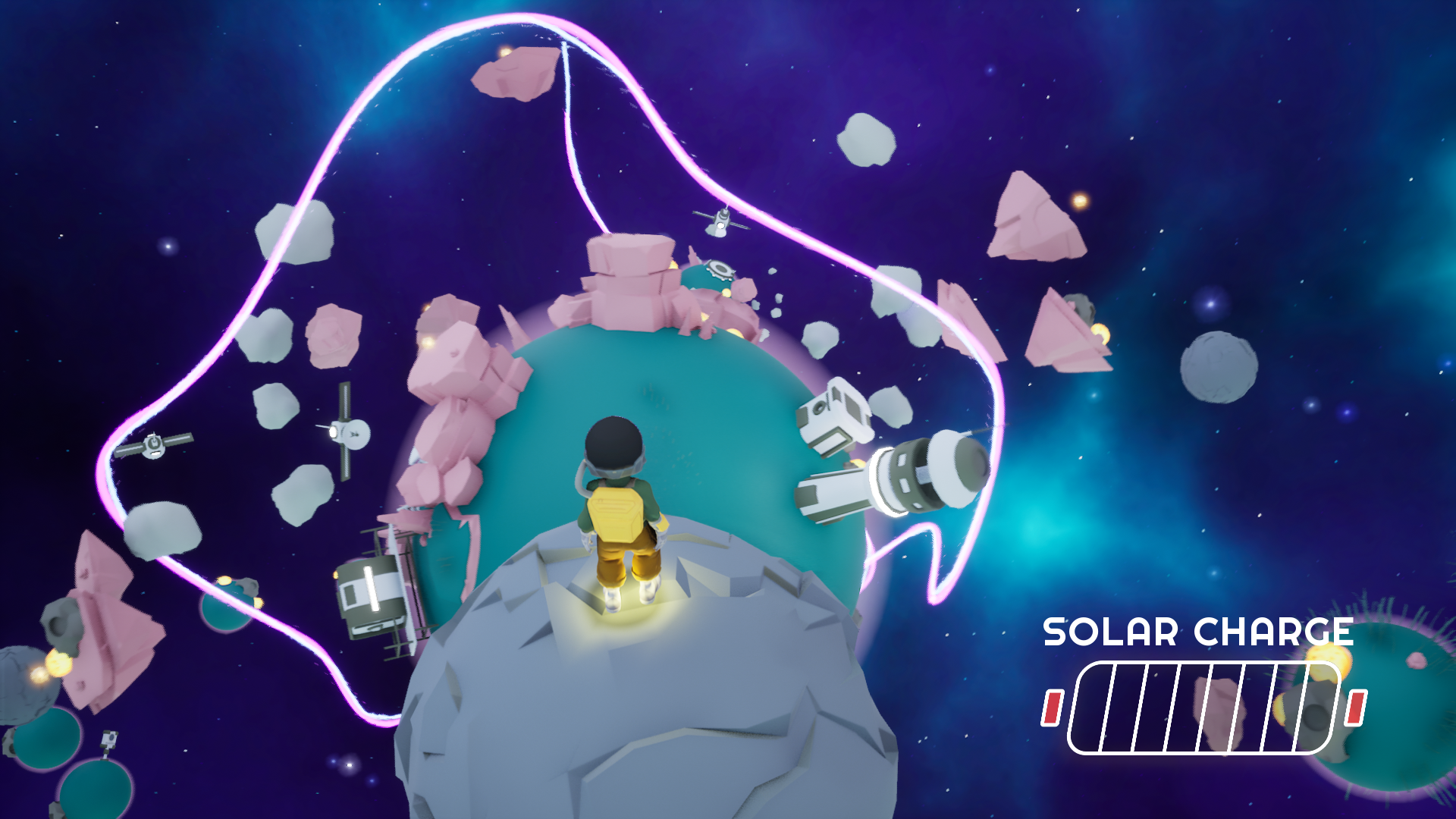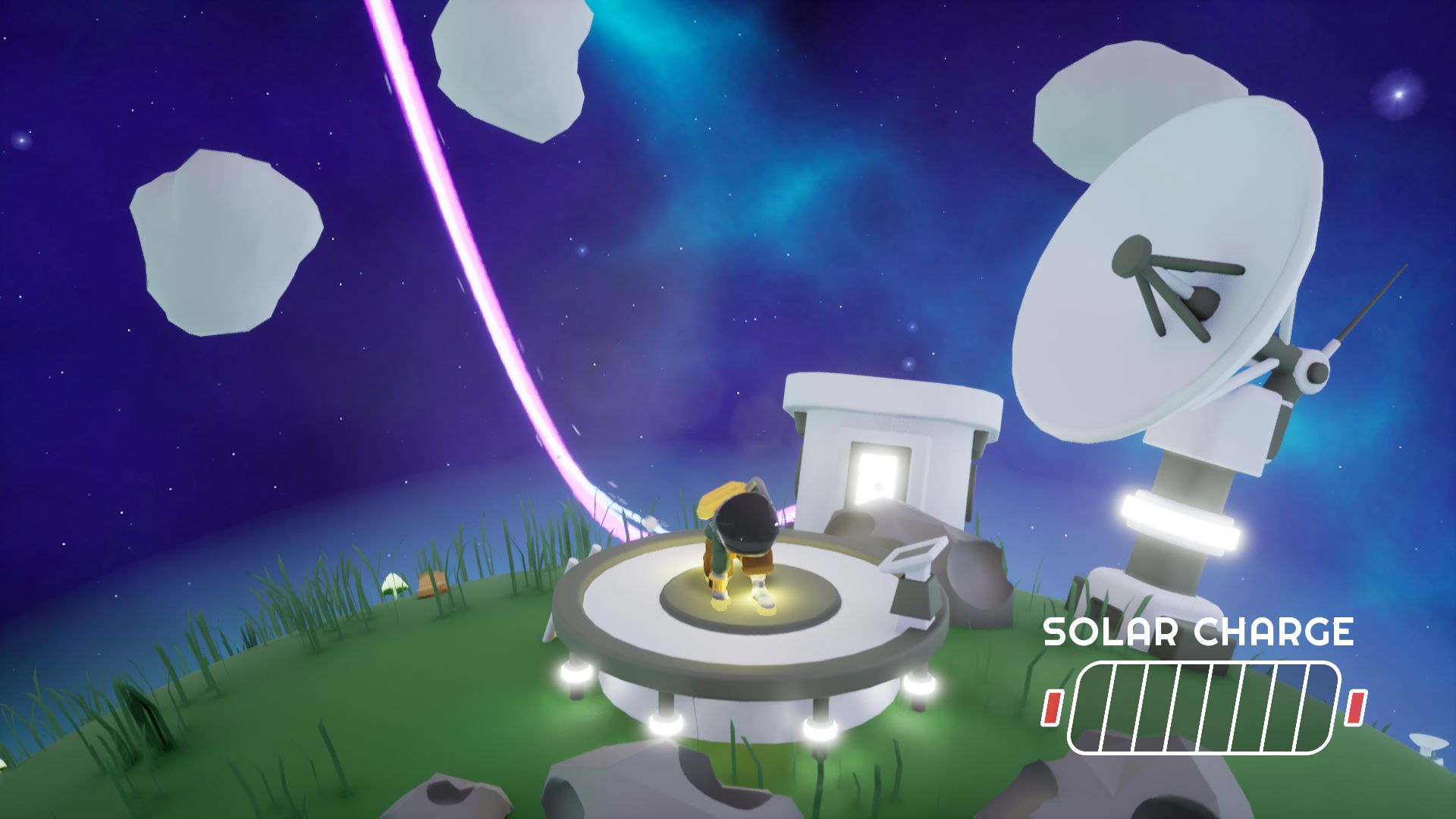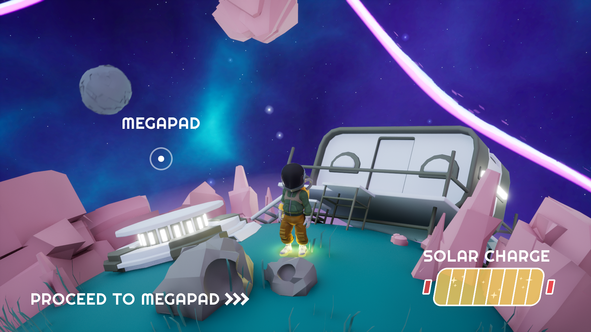 Starting on a planet, the player engages in platforming and exploration. The player needs to collect a certain amount of pickups, orbs of solar energy, to charge up a battery. Once fully charged the player can use a mega jump pad to launch themselves into space. The player is taken to the next planet through a cinematic launch with a superhero landing. This discharges the battery and the player is free to roam and collect pickups once again. The pickup system in combination with the mega jump pads establishes a sense of accomplishment and efficiently conveys game progression.