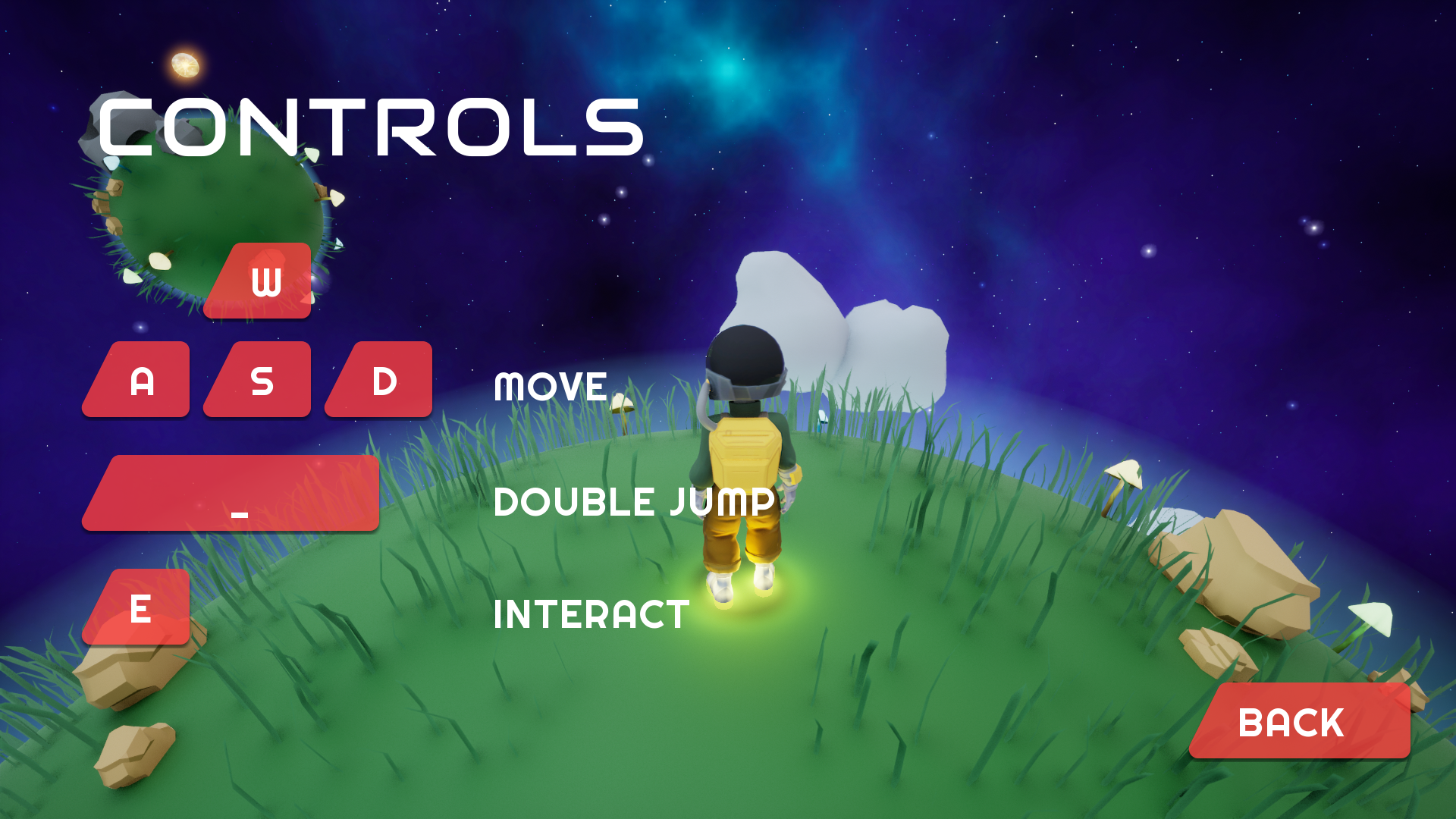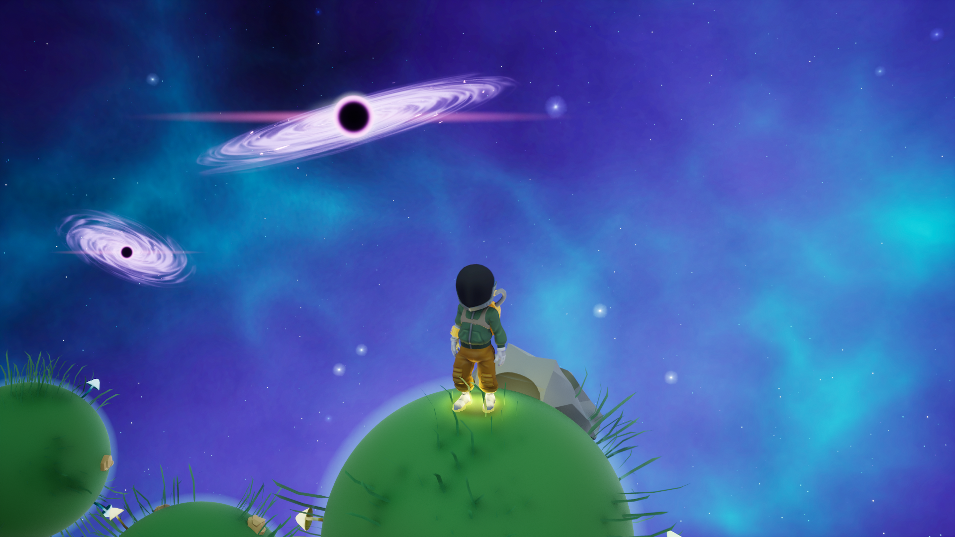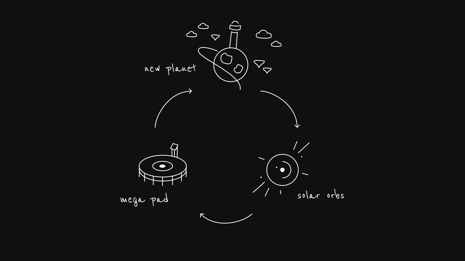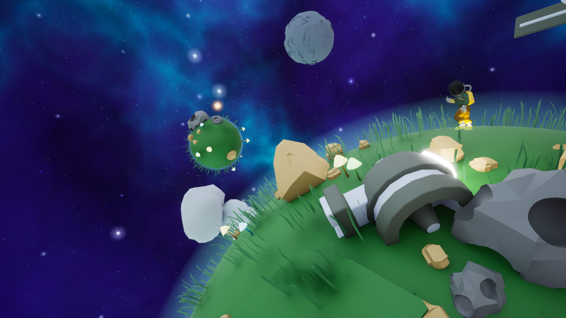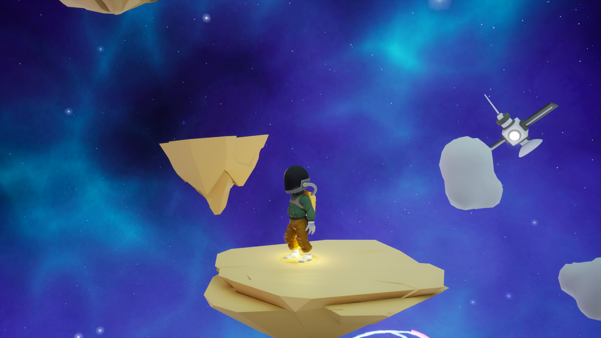 Starting on a planet, the player engages in platforming and exploration. The player needs to collect a certain amount of pickups, orbs of solar energy, to charge up a battery. Once fully charged the player can use a mega jump pad to launch themselves into space. The player is taken to the next planet through a cinematic launch with a superhero landing. This discharges the battery and the player is free to roam and collect pickups once again. The pickup system in combination with the mega jump pads establishes a sense of accomplishment and efficiently conveys game progression.